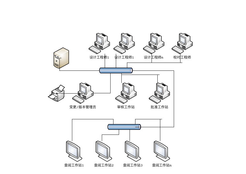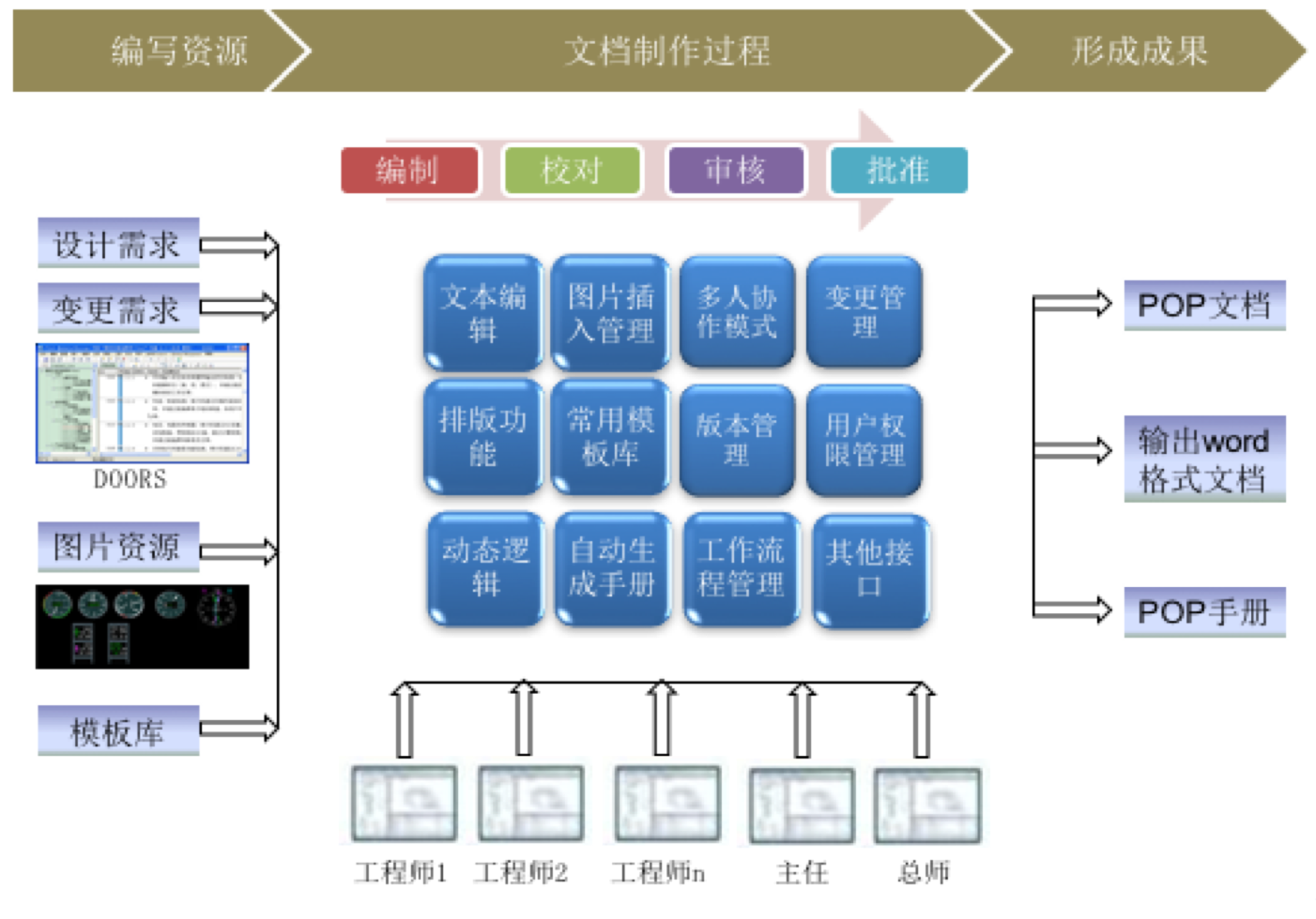 popProducer產品主要解決POP文檔編寫和管理的問題,應用于綜合航電系統的設計部門。根據工作流配置相應的工作站,其中有設計工程師工作站、校對工作站、變更管理工作站、版本管理工作站、審核工作站、批準工作站和查閱工作站,用戶可以根據需要靈活配置相應模塊。典型的應用如下圖所示: